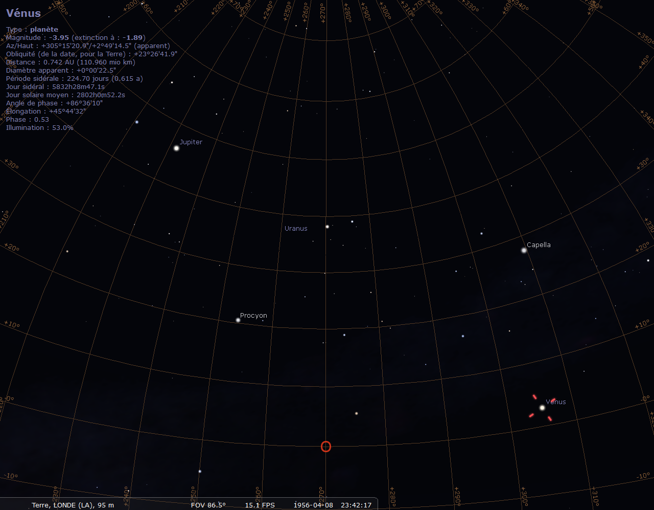 La vérification astronomique indique pour le premier goupe Vénus proche de l'horizon à environ 45° au nord de la direction d'observation, et pour le second groupe qui regarde vers le Nord aucun astre particulier n'est visible.