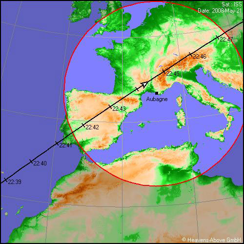 Le 12 mai 2008 entre 22h40 et 22h45 un témoin observe un objet lumineux qui traverse le ciel du Sud au Nord-Est. Cet objet blanc et très lumineux se déplace rapidement en effectuant une courbe dans sa trajectoire. Aucun bruit n'est entendu. Après enquête et confirmation par le REseau Français d'ObseRvation des Meteores (REFORME), ce phénomène s'avère être un passage de l'ISS (Station Spatiale Internationale) visible à Aubagne entre 22h42 et 22h47 à cette date et qui peut désormais être particulièrement lumineuse depuis l'installation des quatre paires de panneaux solaires (sa magnitude pouvant être largement négative,jusqu'à -4 environ).
