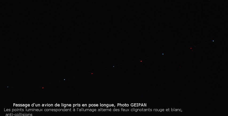 En faisant le parallèle avec la photo en pose longue d'un avion de ligne (ci jointe), où l'on aperçoit une alternance des feux rouge et blanc le long de l'axe de déplacement, allumés chaque seconde, le GEIPAN émet l'hypothèse que ce clignotement ait pu être interprété par le témoin comme un déplacement en chevron.