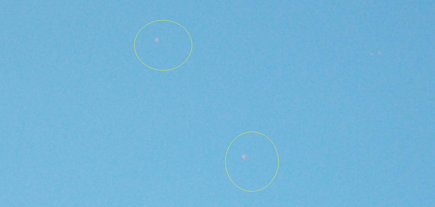 Les caractéristiques de l'observation évoquent un vol de ballons. Les photos parvenues au GEIPAN sont de mauvaise qualité et ne permettent que de distinguer les 2 sphères rouges décrites par le témoin (fichier zoom photoIMGP0422).