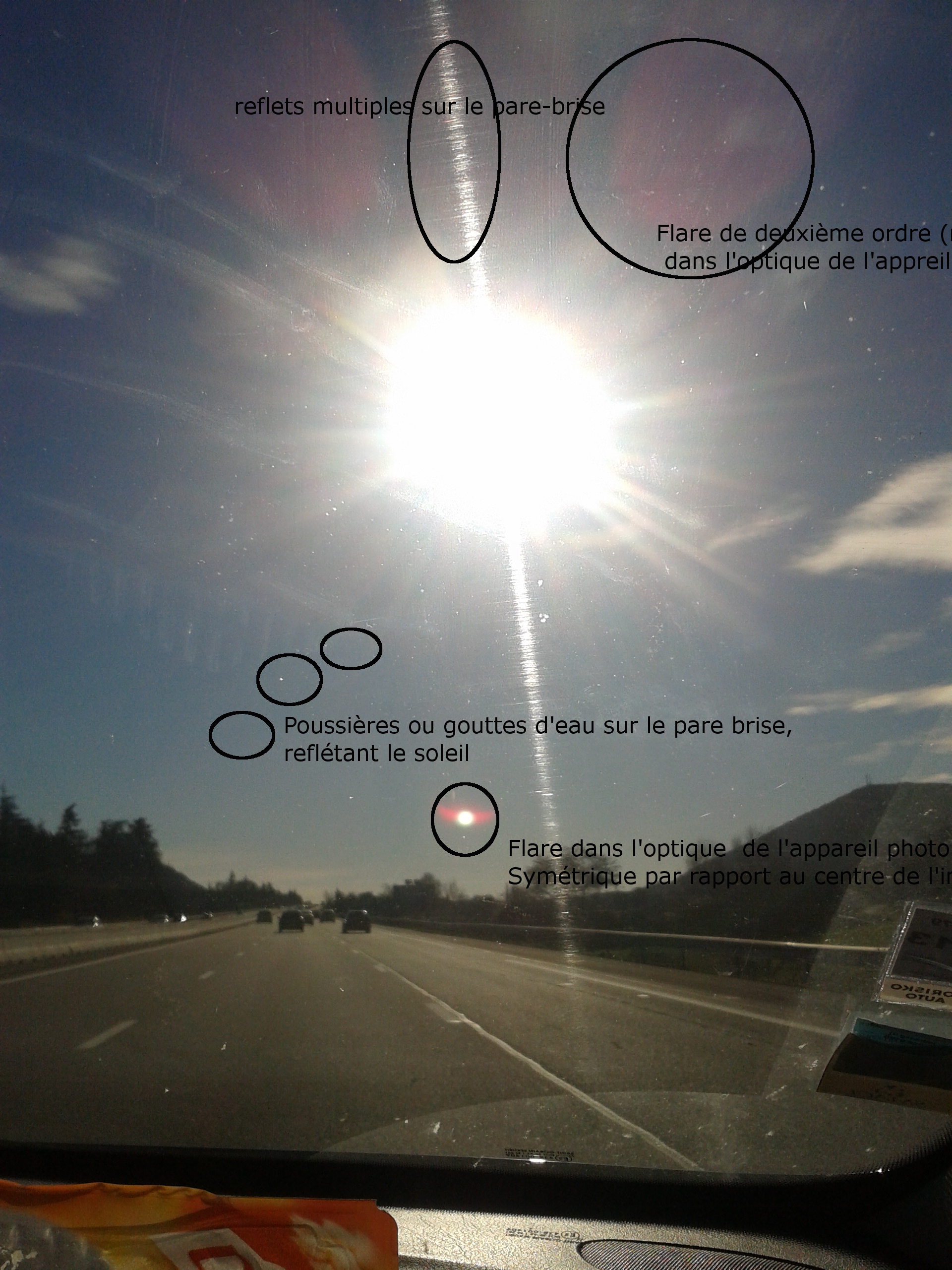 Étant données les conditions d'observation, en voiture face au sud, à l'heure du zénith, proche du solstice d'hiver, les conditions sont idéales pour observer de multiples reflets du soleil sur les vitres ou optique du téléphone.