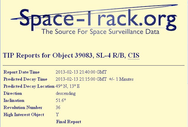 Ces témoignages relatent le passage d'un bolide identifié comme une rentrée atmosphérique d'un étage du lanceur Soyouz SL-4 R/B, (répertorié 39083, ou 2013-007B), lancé le 11 février pour mettre en orbite un vaisseau-cargo Progress à destination de la station spatiale internationale (voir le graphe de la projection au sol de la trajectoire modélisée de l'objet).