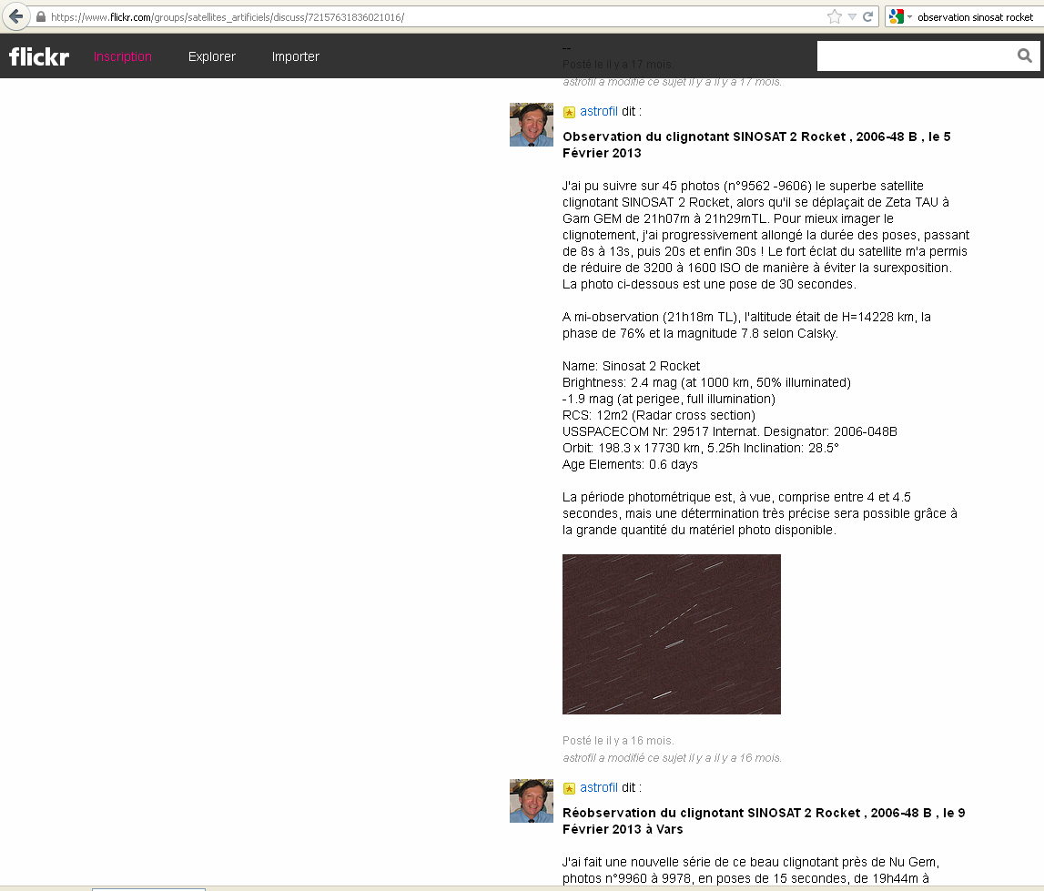Le site Calsky indique ce jour-là à 18h33 le passage du satellite "Sinosat 2Rocket" (3ème étage qui a lancé le satellite Sinosat2) sur une trajectoire d'Ouest en Est compatible avec l'observation.
