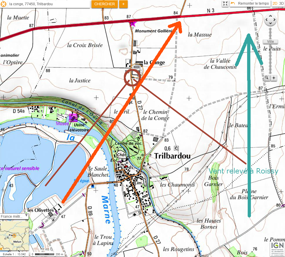 Le déplacement est observé de l'ouest vers le nord Est (voir la carte), ce qui est compatible avec le vent de Sud relevé à Roissy (voir le relevé Météociel du jour de l'observation.