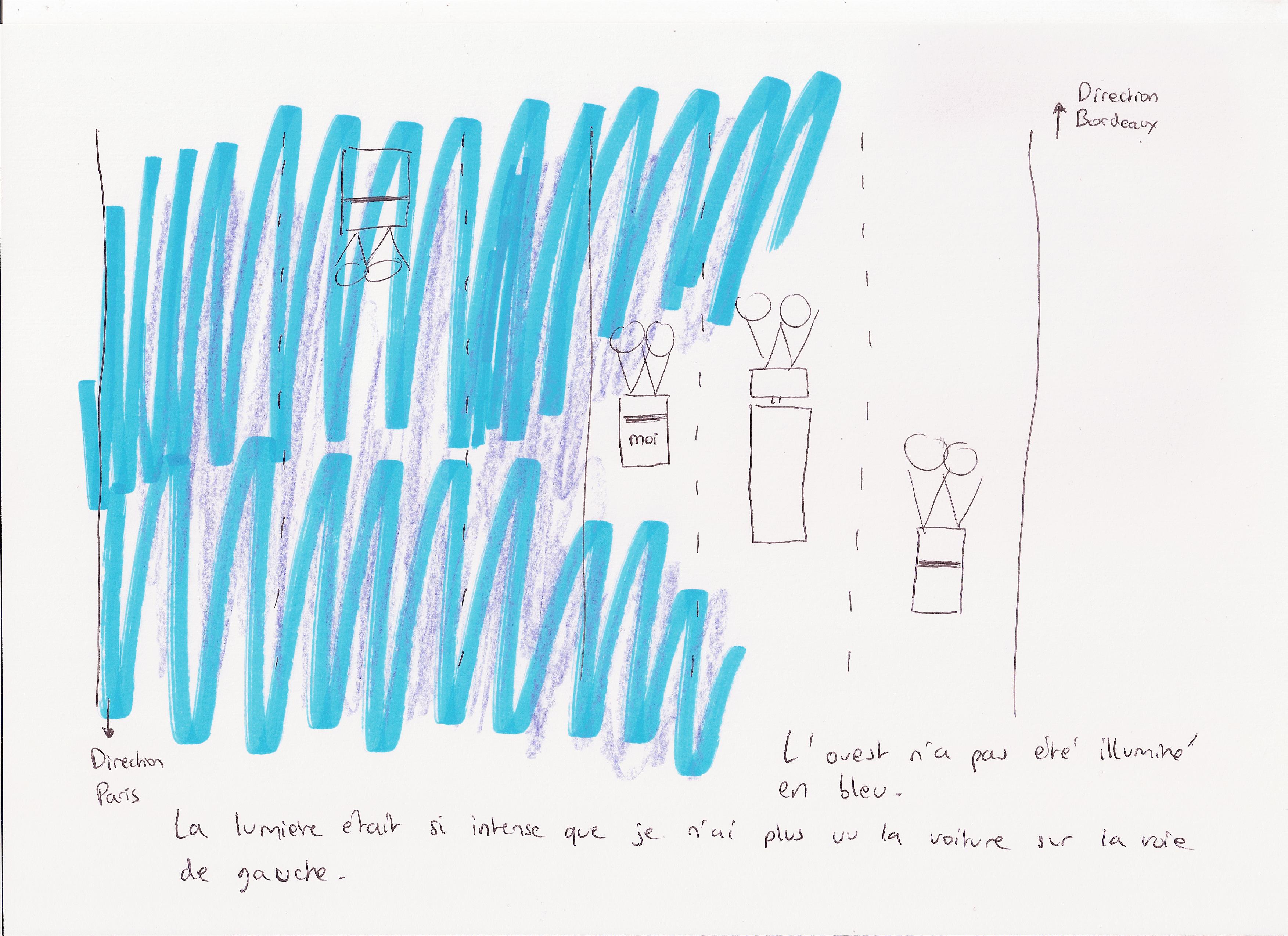 Le 30 janvier 2015 vers 19h un automobiliste circulant sur le périphérique de Bordeaux au niveau de la commune de Carbon-Blanc (33) est soudain apeuré car une très intense lumière bleutée qui "recouvre tout l'environnement dans son champ de vision" (voir le dessin du témoin). Aucun bruit particulier n'est entendu. Pensant à la lumière émise par un gyrophare, le conducteur cherche à voir dans son rétroviseur un véhicule particulier mais il ne voit rien de tel. Aucune information n'est donnée à la radio. L'automobiliste continuera sa route hébété. Aucun autre témoignage ne sera recueilli sur ce phénomène.