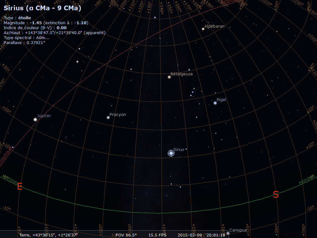 L'observation longue (une heure) d'un objet fixe dans le ciel, ayant des aspects d'une étoile, oriente vers un phénomène astronomique lointain. Le témoin indique les direction de Clayrac (azimut ~ 165° ) ou Prayssas (azimut : 142°). On remarque sur la carte du ciel ci-jointe l'étoile Sirius, la plus brillante étoile du ciel nocturne, visible à l'azimut 143° à 21° d'élévation.