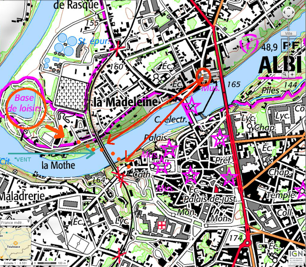 Le déplacement est observé de l'Ouest vers le Sud-Ouest, ce qui est compatible avec le léger vent d'Ouest relevé à Albi (voir carte et relevé Météociel).