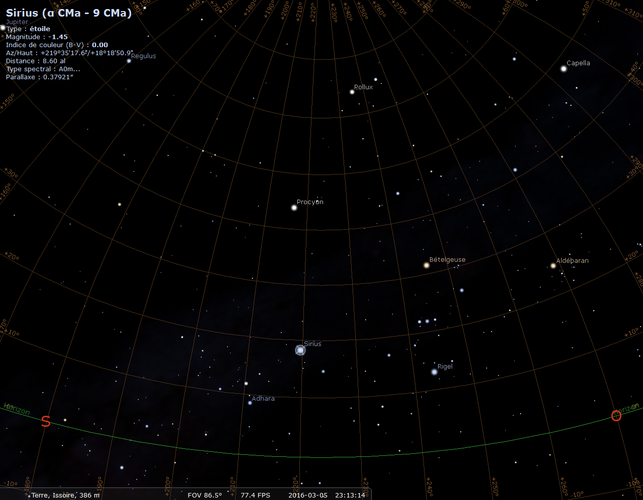 Or entre 23H et 23H30, Sirius évolue entre l'azimut 215°(SSO) à une élévation de 15° et l'azimut 225° (SO) à une élévation de 13° (voir en pièce jointe carte du ciel avec Stellarium).