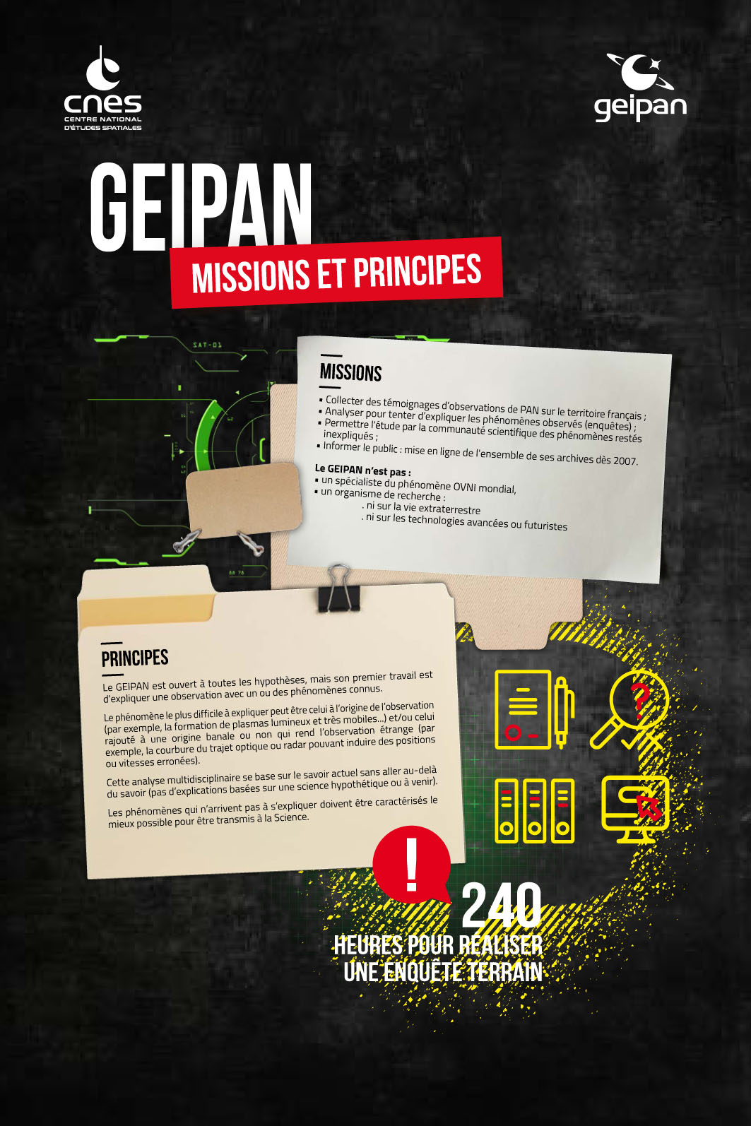 Le GEIPAN, Groupe d’Études et d’Information sur les Phénomènes Aérospatiaux Non Identifiés fait partie intégrante des missions du Centre National d'Études Spatiales (CNES). Le GEIPAN a pour missions :